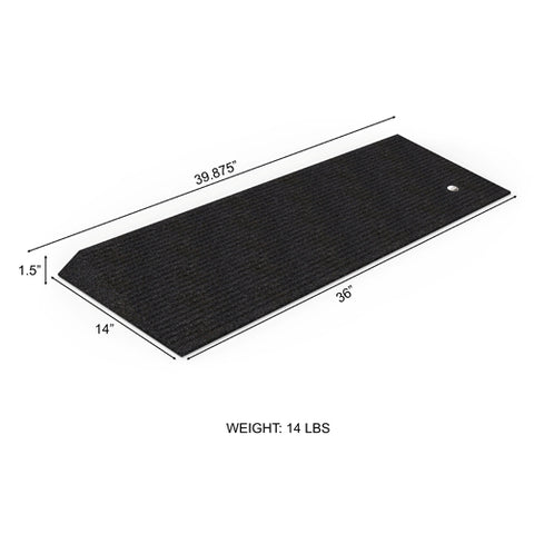 Made With 100% Recycled Rubber * Eco-friendly And Can Be Used Safely On Nearly Any Surface * Slip-resistant * By Nature The Recycled Rubber Material Is Slip-resistant So You Can Feel Secure And Confident When Using The Mat. It Truly Is A Safe Welcome Mat For Any Home * Beveled Edges * Allows Cross-traffic Access And Provides An Attractive Finished Look * Indoor And Outdoor Use * This Durable Mat Can Withstand Harsh Weather Conditions And High Traffic Use * Anchoring Hardware Is Included * Made In The Usa And Carries A Lifetime Warranty * Usable Size (l X W X H) 14 X 36 X 1.5 * Overall Size (l X W X H) 14 X 40 X 1.5 * Usable Height 1.5 * Weight 14 Lbs * Weight Capacity 850 Lbs * For Wheelchairs And Scooters
