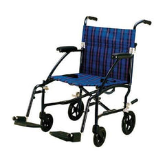 Blue Frame & Blue Plaid Upholstery * Aluminum Frame Is Lightweight And Strong * Comes With Carry Pocket On Back Rest. * Comes With Seat Belt For Added Safety * Attractive Plaid Style Nylon Upholstery * Tool Free Height Adjustable Swing-away Footrests Come Standard * 8 Casters In Rear. 6 Casters In Front * Back Folds Down For Storage And Transport And Features Deluxe Back Release * Comes With Aluminum Rear Wheel Locks * Overall Width: 22 (open) 9 (closed) * Overall Height: 36 * Seat To Floor Height: 18 * Back Height: 18 * Seat Width: 19 * Seat Depth: 15.5 * Overall Length W/ Riggings: 33 * Weighs Only 14.5 Lbs * Carton Shipping Weight: 19.5 Lbs * Weight Capacity: 300 Lbs * Limited Lifetime Warranty * Hcpcs Suggested Code: E1038