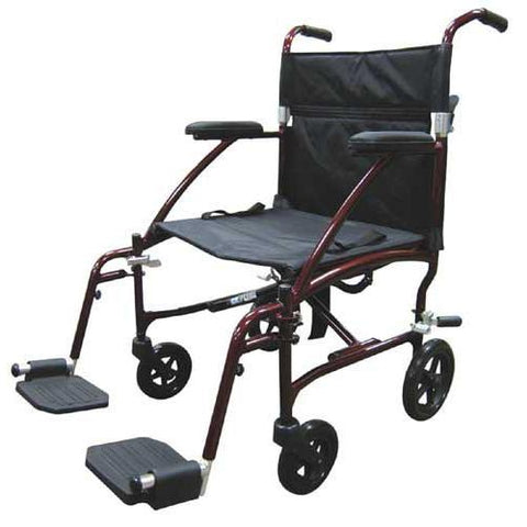 Burgundy Frame & Black Plaid Upholstery * Aluminum Frame Is Lightweight And Strong * Comes With Carry Pocket On Back Rest. * Comes With Seat Belt For Added Safety * Attractive Plaid Style Nylon Upholstery * Tool Free Height Adjustable Swing-away Footrests Come Standard * 8 Casters In Rear. 6 Casters In Front * Back Folds Down For Storage And Transport And Features Deluxe Back Release * Comes With Aluminum Rear Wheel Locks * Overall Width: 22 (open) 9 (closed) * Overall Height: 36 * Seat To Floor Height: 18 * Back Height: 18 * Seat Width: 19 * Seat Depth: 15.5 * Overall Length W/ Riggings: 33 * Weighs Only 14.5 Lbs * Carton Shipping Weight: 19.5 Lbs * Weight Capacity: 300 Lbs * Limited Lifetime Warranty * Hcpcs Suggested Code: E1038
