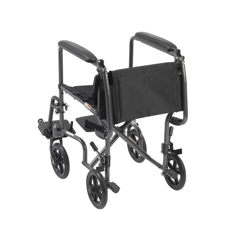 17 Black Upholstery * Silver Vein Frame * Back Folds Down For Storage And Transport * Swing-away Footrests Come Standard * Comes With Seat Belt For Added Safety * Padded Armrests Provide Additional Comfort * 8 Casters In Front And Rear * Comes With Attractive Nylon Upholstery That Is Durable And Easy To Clean * Standard Rear Wheel Locks * Comes With Upholstery Handles To Fold Chair * Overall Width W/ 17 Seat: 18 (open) 8 (closed) * Overall Height: 39 * Seat To Floor Height: 19 * Back Height: 18 * Seat Depth: 16 * Overall Length W/ Riggings: 33 * Weighs Only 26 Lbs * Carton Shipping Weight: 31 Lbs * Weight Capacity: 250 Lbs * Limited Lifetime Warranty * Hcpcs Suggested Code: E1038